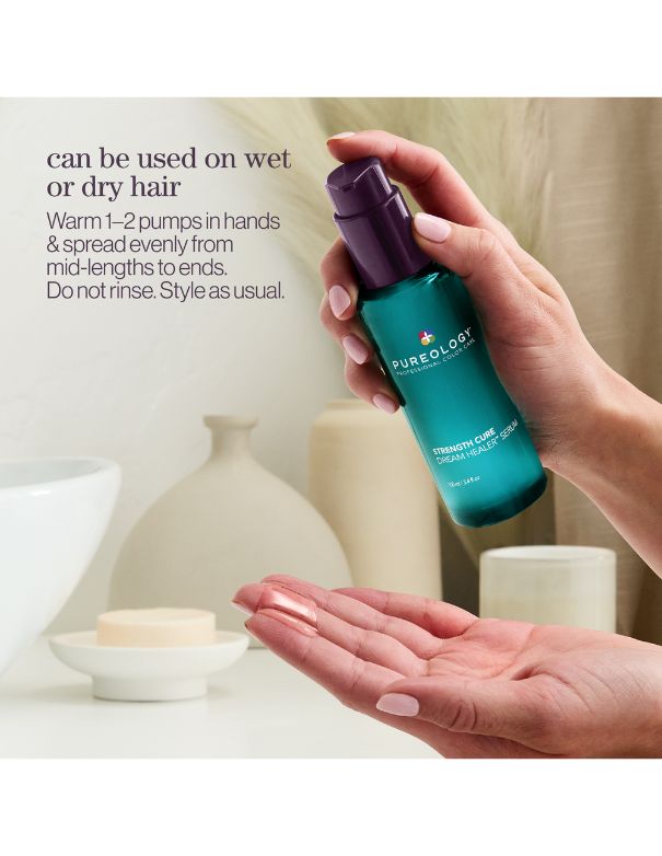 Strength Cure Shampoo & Conditioner's fortifying formulas helps heal hair for the perfect balance of strength and velvety softness with extraordinary color protection, while Strength Cure Dream Healer Serum seals split ends, infuses long-lasting shine, and offers heat protection up to 450 °F!